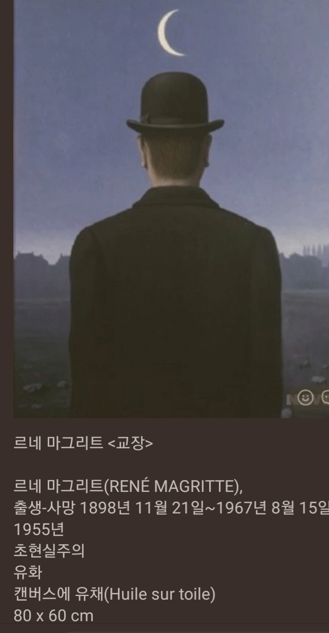 르네 마그리트의 그림 '교장'처럼 담대한 희망이 보이는 반듯한 양복이 아니었다. 한결 부드럽고 따뜻한 적갈색의 양복을 입은 작은 아버지는 막내의 안부를 물으며 울듯이 웃으셨다.