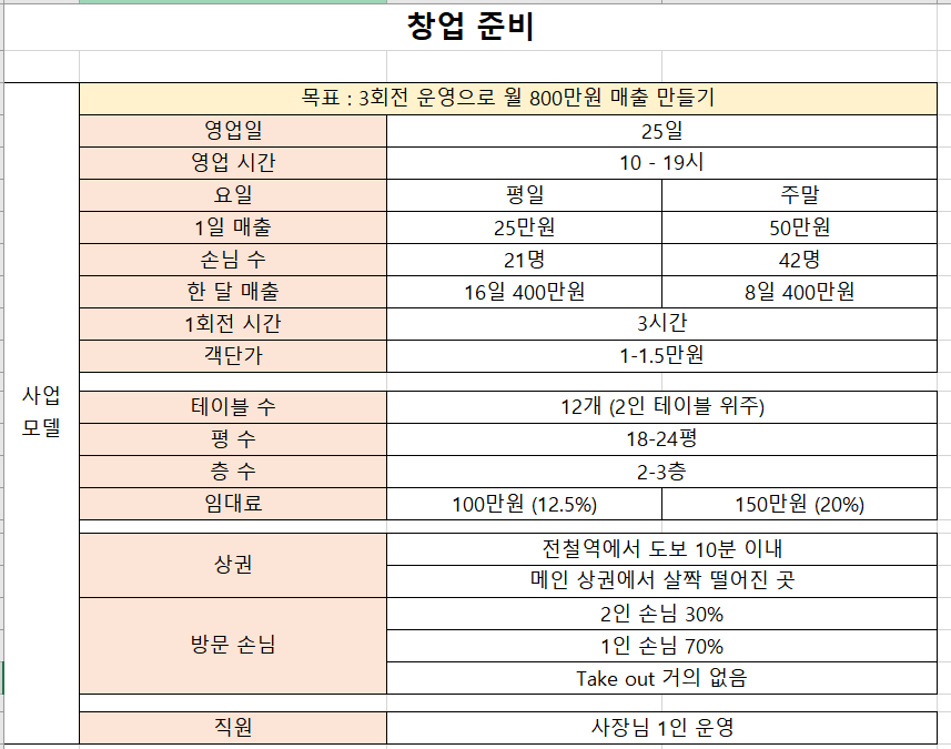 만약 여기서 추가적으로 임대료가 높아지게 된다면, 인건비나 이익에서 줄여야 한다. 물론 가장 이상적인 것은 임대료가 높아졌으니, 그만큼 매출을 올리는 것이겠지만. 1차 목표를 설정하는 계획을 세운다고 보면, 800만 원 이상의 매출을 올리는 건 다음 스텝으로 고려할 부분이다.