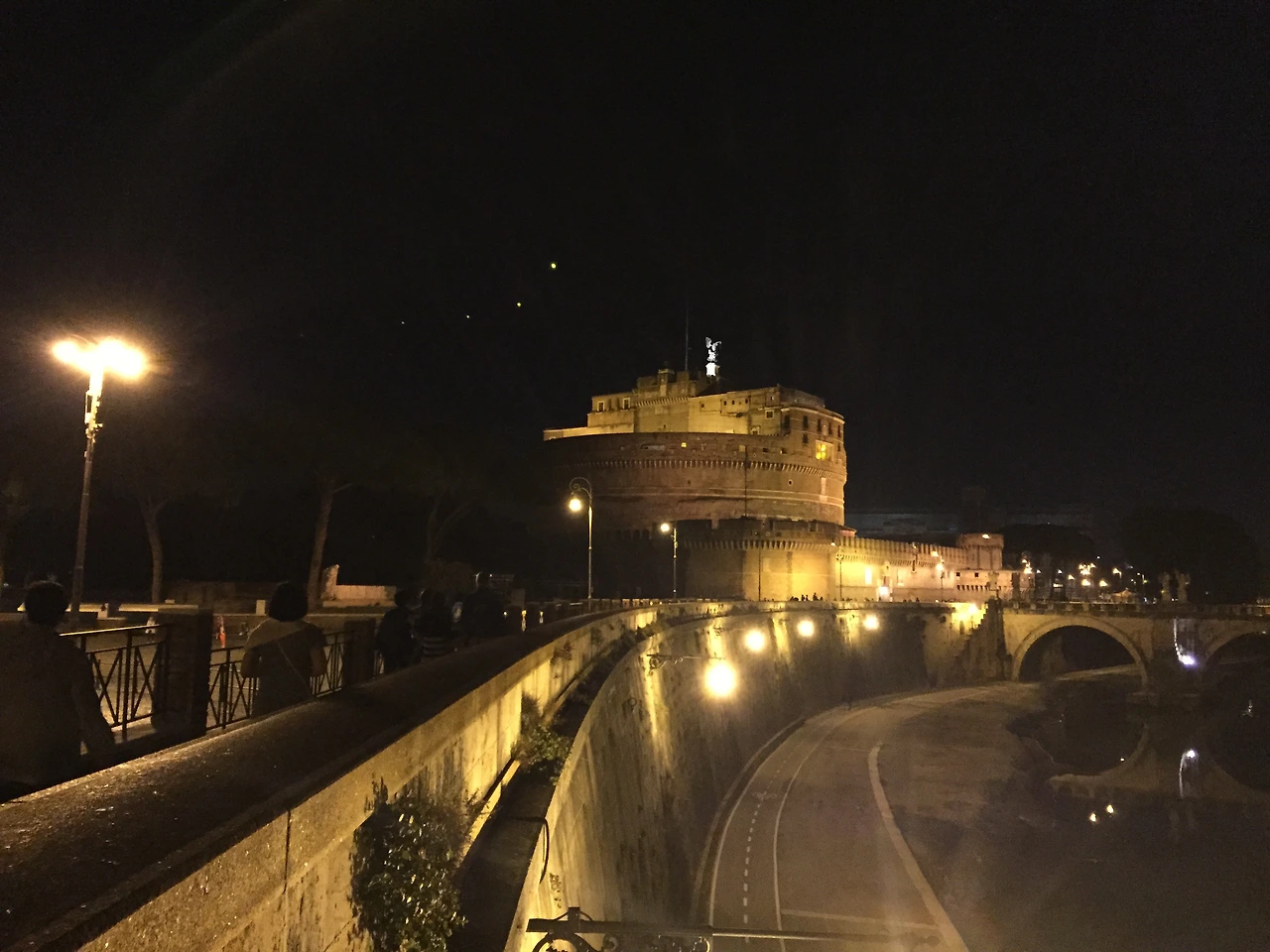 이번 저녁도 골목 어딘가에 있던 식당에서 와인과 곁들인 식사를 마치고 강을 따라 걷습니다. 여기가 어디인지도 모른 채 걷다 보니 저 멀리 불이 환하게 밝혀진 성이 보입니다. 바로 로마의 야경을 제대로 즐길 수 있는 천사의 성입니다. 알고 찾아간 건 아닌데 마냥 손 잡고 걷다 보니 찾아낸 야경 명소네요.