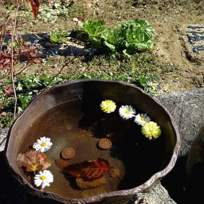 마당을 정리하다 흰 국화 몇 송이가 떨어졌다. 덕분에 향은 진하게 퍼지는데 아쉽고 안타깝다. 수반이 생각났다. 그리고 오래된 동백꽃의 기억도 떠올랐다. 이왕에 떨어진 흰 국화를 주워들고, 멀쩡히 바람을 타던 노란 국화 모가지를 댕강 꺾어 수반에 띄웠다. 사라져 가던 빛이 살아났다.
