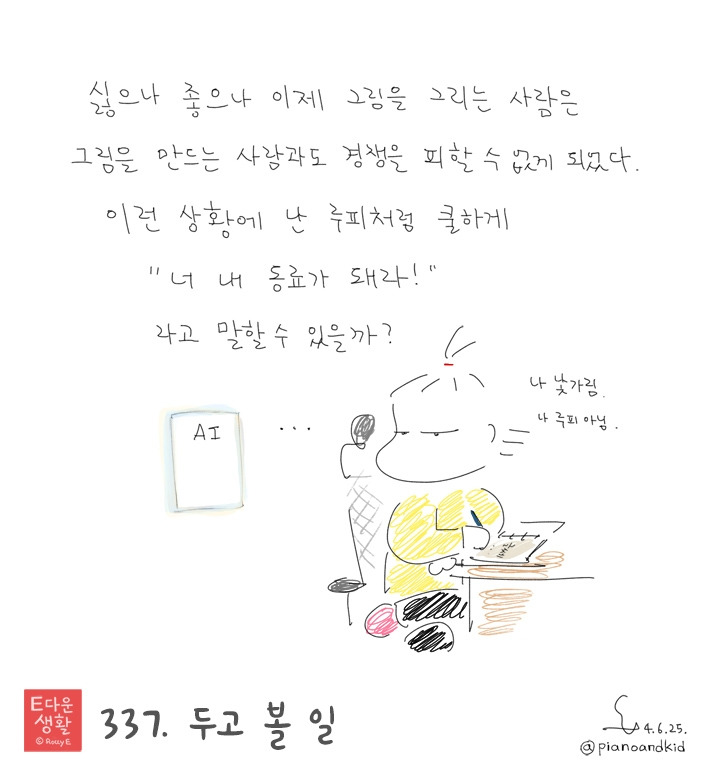 그럼에도 여전히 손으로 그리는 그림이 좋고, 그렇게 만들어진 '인간적인' 그림을 더 가치 있게 느끼는 한 사람으로서 아직까지는 이 21세기에 나타난 도깨비 같은 동료와 함께 할 필요성은 못 느끼고 있다.