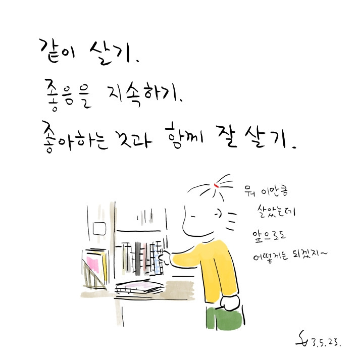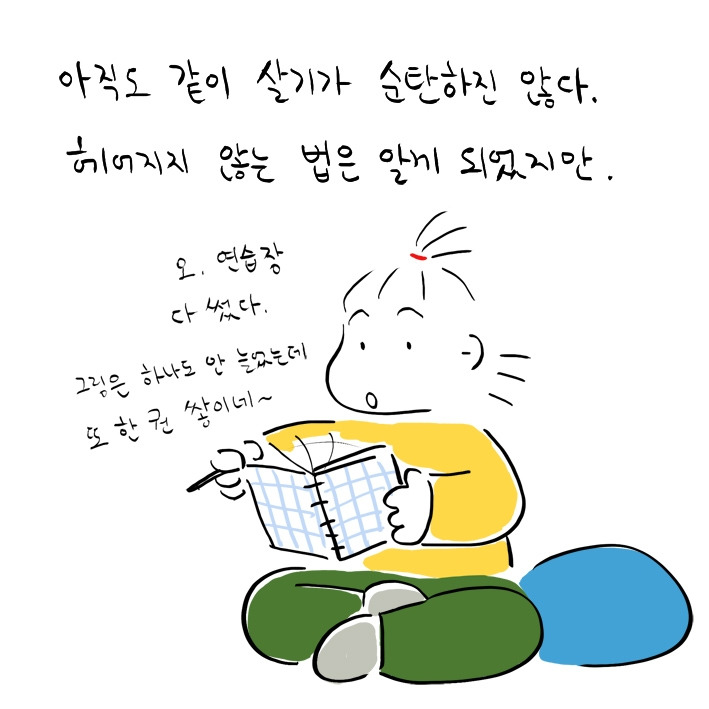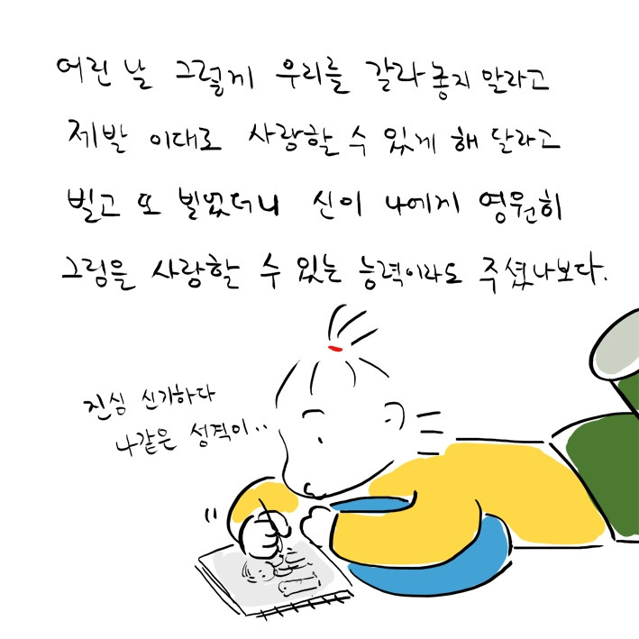 그리고 내가 지금 원하는 것은 보다 잘 살기이지 어린 날처럼 영영 못 그리게 될까 봐 혹은 정말 포기해야 되는 걸까 하는 두려움은 아니라는 것도 알 수 있다.