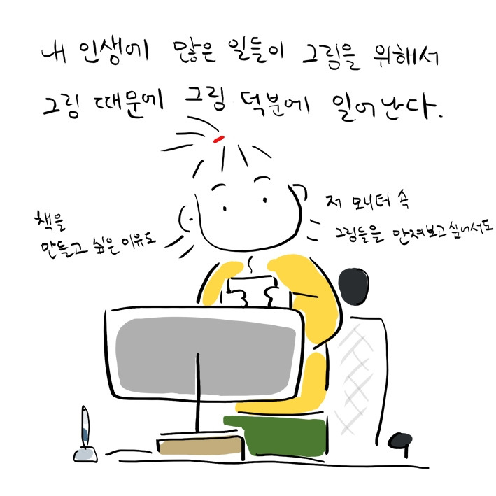 일로서 그리는 그림 틈틈이 좋아서 그리는 그림을 그리며 어떻게 하면 이 둘 사이 간격을 최대한 좁힐 수 있을지 아주 긴 수식을 거쳐야만 풀 수 있는 수학문제처럼 혹은 수차례의 실험을 거쳐 어렵게 증명을 도출했지만 또 다른 변수가 닥쳐서 처음부터 다시 실험에 돌입하게 된 과학 문제처럼