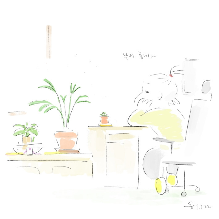 왱왱대는 컴퓨터 옆자리에서 환기도 햇살도 다 썩 마음에 들지 않을 텐데