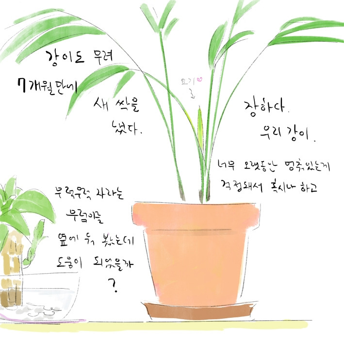 '강'이는 무렄이보다 반년정도 먼저 온 아레카야자인데 그전 여름에 한 번의 죽을 고비를 넘겼다.