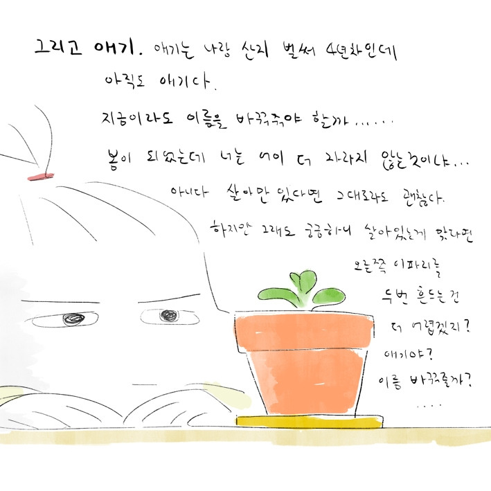 정착하지 못하는 생활에 식물조차 기를 엄두가 안 나다가 드디어 해가 잘 드는 작업실이 생긴 것이 기뻐 그나마 기르기 쉽다는 다육이를 그때 소심했던 내 마음만큼이나 작은, 그렇지만 가장 예뻤던 아이를 업어왔는데. 그 아이는 4년째 아이인 모습으로 버티고 있다.