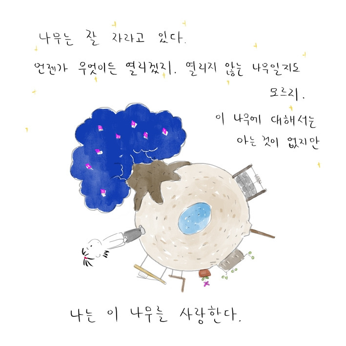 과거 그림에서 저 나무가 겨우 여린 잎 몇 장이 전부이던 앙상한 가지의 겨울나무였던 것을 기억한다. 어느새 두 팔로 안아도 다 안을 수 없을 만큼 아름드리나무로 자라나 준 것이 새삼스럽고 고맙다. 그 잎이 파란색으로 무성해지게 될 것은 미처 예상하지 못했던 일이긴 하지만 말이다.