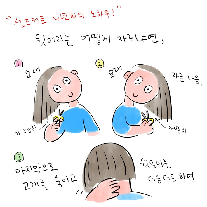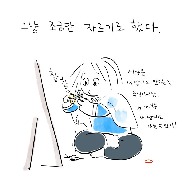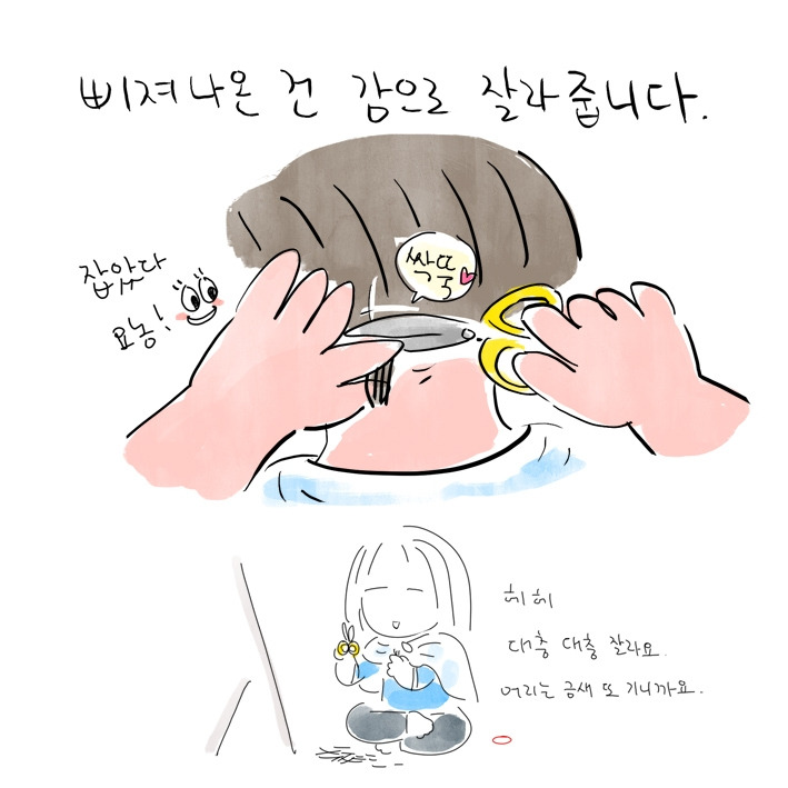 어설프더라도 이리저리 내 맘대로 머리를 잘라보는 시간이 나에게는 마치 성인이 됨과 동시에 사라져 버린 미술시간을 되찾은 것 같은 기분이 든다.