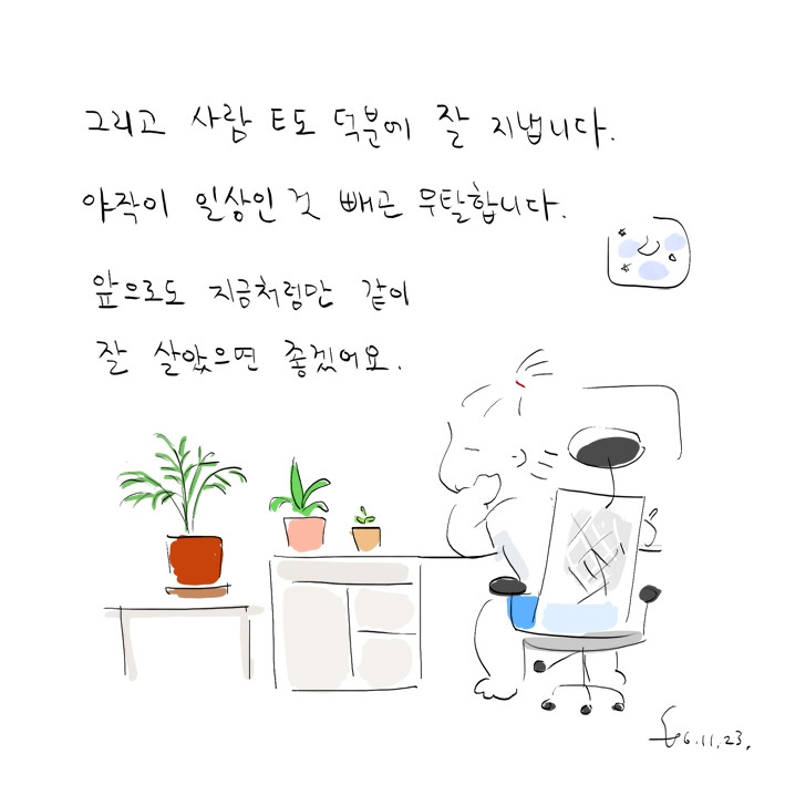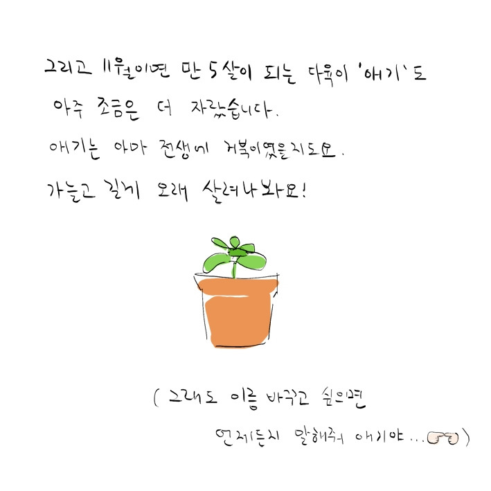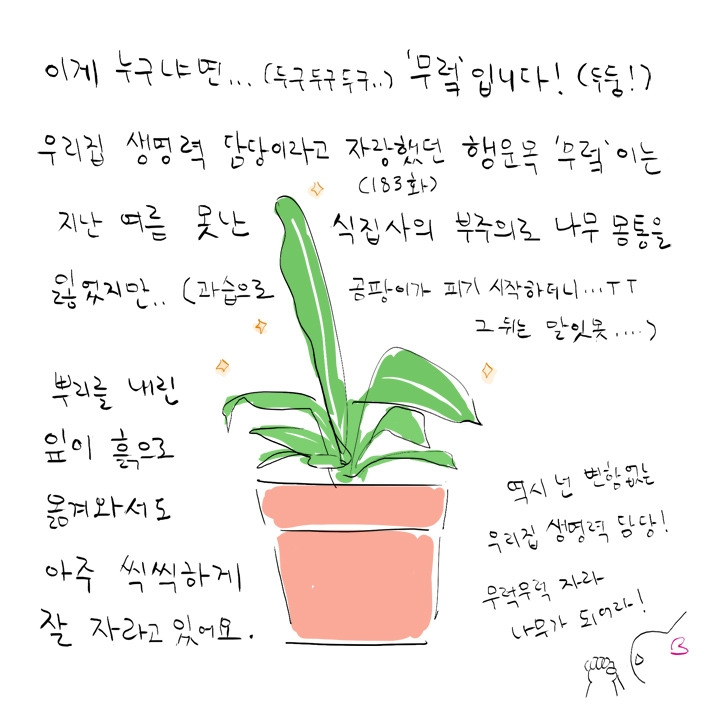 그래서 일요일마다 기록하는 이 그림일기가 나를 아는, 또는 모르는 누군가에게 닿는 일종의 생존보고서 같은 것이기도 하다면 나 말고 나와 함께 살아있는 이 친구들의 근황도 전해주고 싶었다.