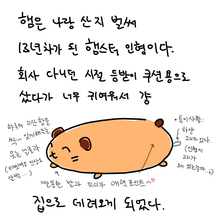 나는 동네 잡화점에서 각기 다른 동물들 사이에 끼어 있던 유일한 햄스터 햄을 만났지만 어딘가에서는 햄과 똑같은 모습을 한 인형들이 진열대에 쭈욱 걸려 있었을 것을 상상해 본다. 그리고 그 많고 많던 햄의 형제들 중에 햄이 그 마트로 보내져서 나와 눈이 마주쳤던 그 순간을 떠올린다. 그리고 회사를 거처 세 번의 이사를 하는 동안에도 계속 함께했던 햄을 떠올린다.