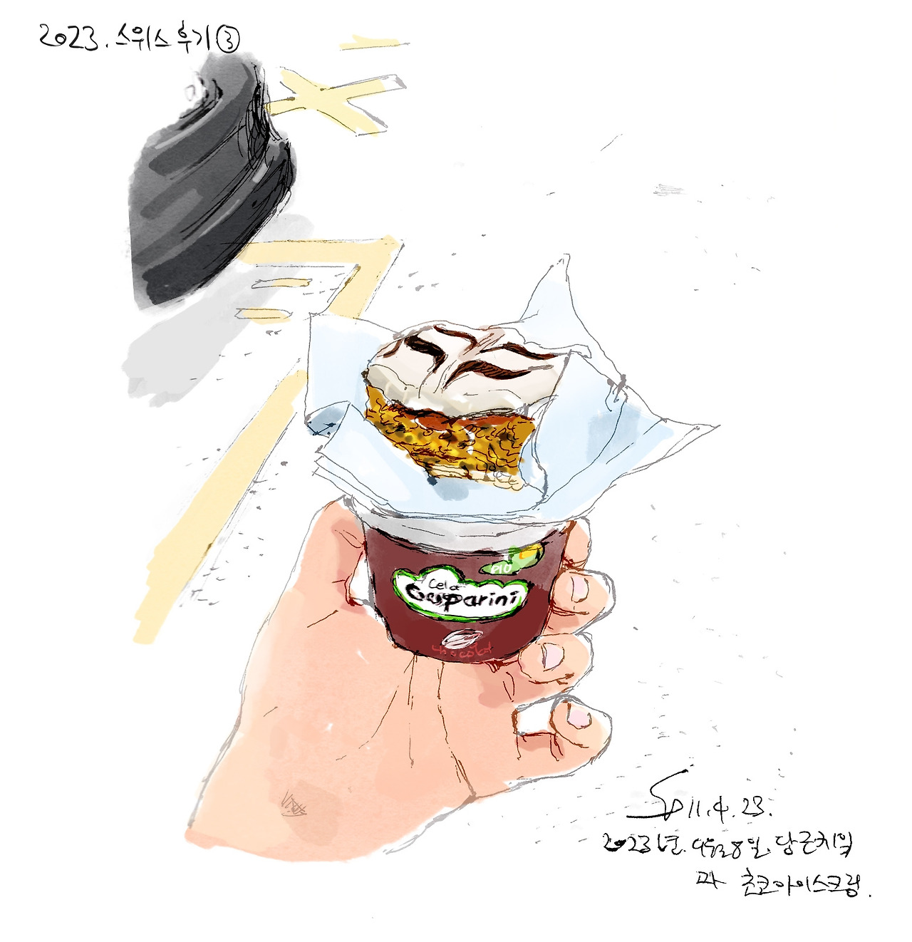 그래, 지구 온난화도 걱정인데 포장지를 줄여야지, 스위스는 공기가 맑으니 10분 정도 이렇게 들고 가는 것쯤이야 문제없지! 하고 휴지로 대충 싸서 조심스럽게 들고 가는데 눈앞에 케이크가 너무 먹음직스러워 보인다.
