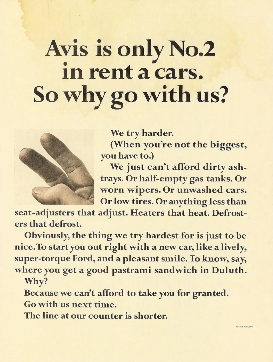 렌터카 시장이 헤르츠와 에이비스 양강 체제로 새롭게 재편되는 역사적인 한마디였습니다. 재미있는 건, 사실 에이비스는 당시에 2등 기업이 아니었다는 것. 1952년에 설립된 후 13년 내리 적자에 시달려온 기업으로서, 이 카피가 등장한 1962년에는 적자 규모가 자그마치 125만 달러에 육박하고 있었지요. 2등이기는커녕 당장 문 닫아야 할지도 모르는 비전 없는 회사에 불과했습니다.