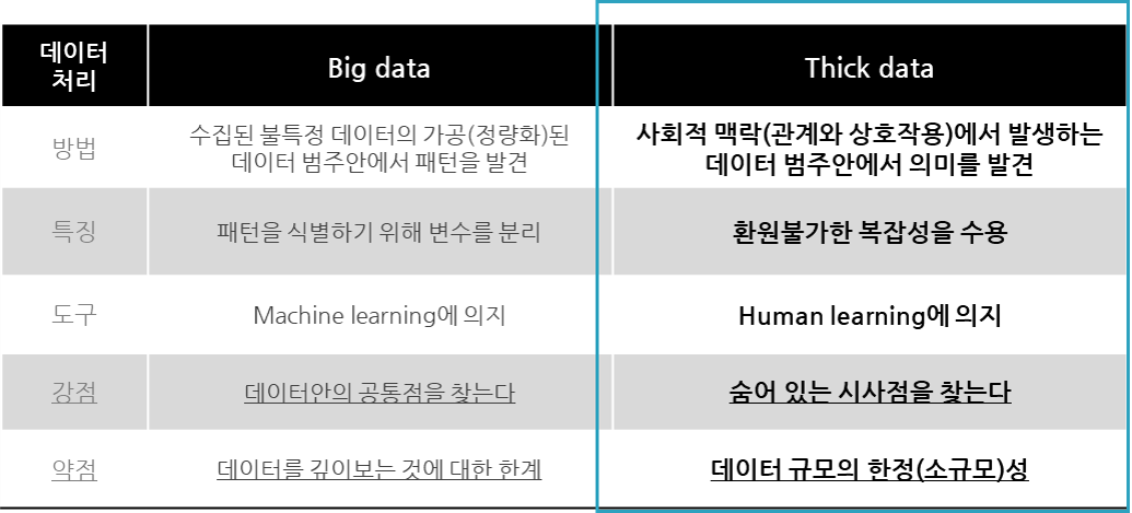 * 위의 표는 'Why Big Data Needs Thick Data(Medium)'의 내용을 기준으로 저자가 보강하였음.