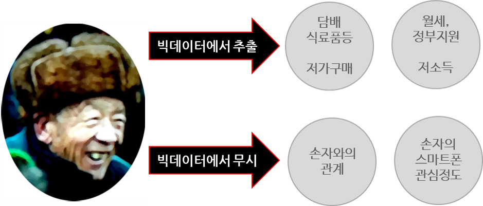 그런데, 이 노인은 6개월뒤에 100만원씩이나 하는 스마트폰을 구매하였다. 어떠한 데이터를 분석해보더라도 그러한 징조는 없었다. 이 상황을 어떻게 해석할 수 있을까? 그 노인에게 직접 물어봤지만, 그냥 샀다고만 하고 화를 냈다. 원인을 알 수 없었다. 이번에는 그노인을 조용히 쫓아다녀봤다. 그가 일하는 곳에 위장 취업도 하고, 그림자처럼 따라다녀도 봤다. 한 십여일이 지나자 그가 왜 스마트폰을 샀는지 이해할 수 있었다.