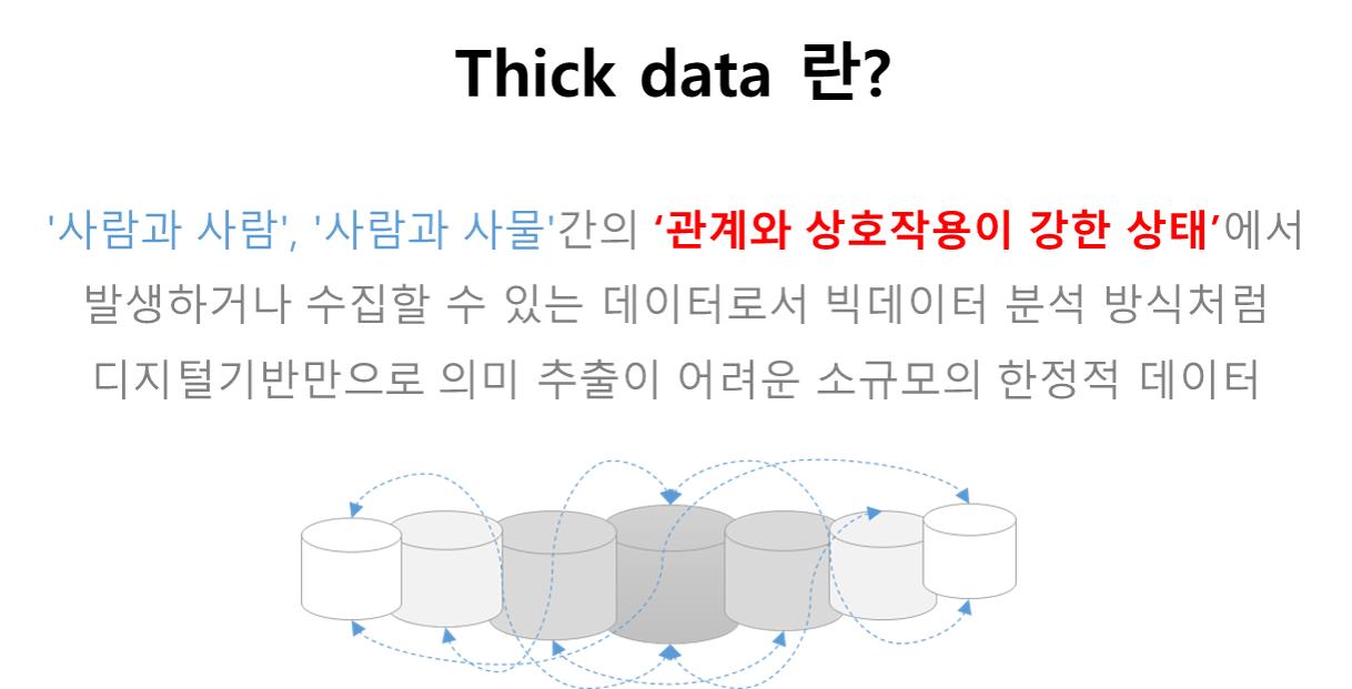 '사람과 사람', '사람과 사물'간에 '관계와 상호작용이 강한 경우'에서 발생하거나 수집할 수 있는 데이터 분석에서는 thick data적 접근이 중요
