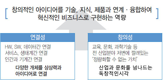 - 4차 산업혁명에서 소프트 파워는 ‘창의적인 아이디어를 기술, 지식, 제품과 연계·융합하여 혁신적인 비즈니스로 구현하는 역량’을 의미하며, 소프트파워의 핵심 구성요소는, 다양한 개체를 상상력과 아이디어로 연계하는 ‘연결성 (Connectivity)’과 산업, 문화를 넘나드는 독창적인 시각인 ‘창의성 (Creativity)’으로 이루어짐.