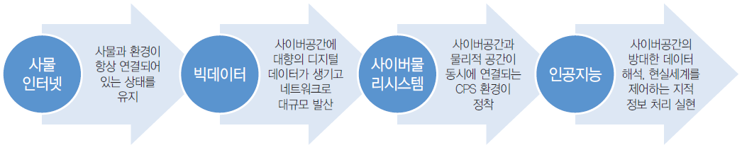 o 초지능화, 초연결화 등의 일련의 과정을 통해서 실제 현실(Physical)의 세계와 사이버(Cyber) 세계가 연결됨으로써 서로 새로운 피드백과 진화를 거듭하게 되고, 이를 글로벌 CPS(Cyber Physical System) 생태계라고 칭함.