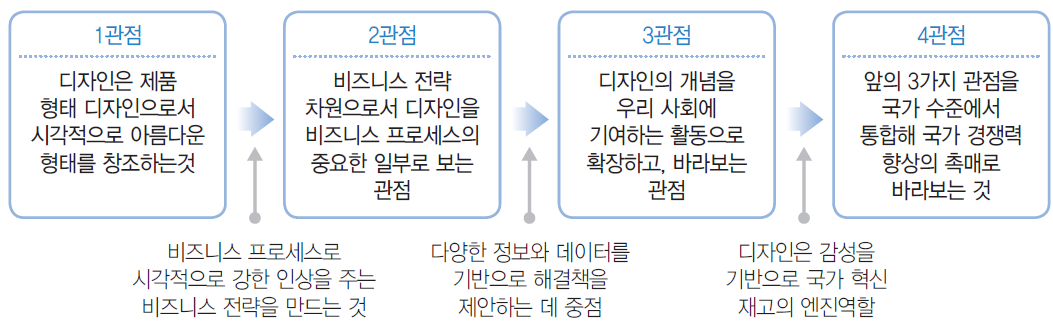 o 디자인에 대한 관점은 처음 시각적 아름다움을 창조하는 관점에서 이제는 비즈니스 전략과 사회에 기여하는 부분까지 확장되고 있으며, 이제는 감성을 기반으로 하는 국가 혁신 재고의 엔진 역할을 하고 있다는 것을 인식해야 함.