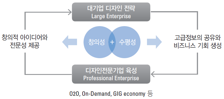 - 대기업에서는 고급 정보의 공유와 디자인 비즈니스 기회를 제공하고, 디자인 전문기업에서는 분야별 전문성과 창의적 아이디어를 제공하여 ‘창의성’과 ‘수평성’ 관점에서 상생과 협력하는 우리나라만의 ‘디자인 공유경제’를 구상하고, 실현하는 것이 필요함.
