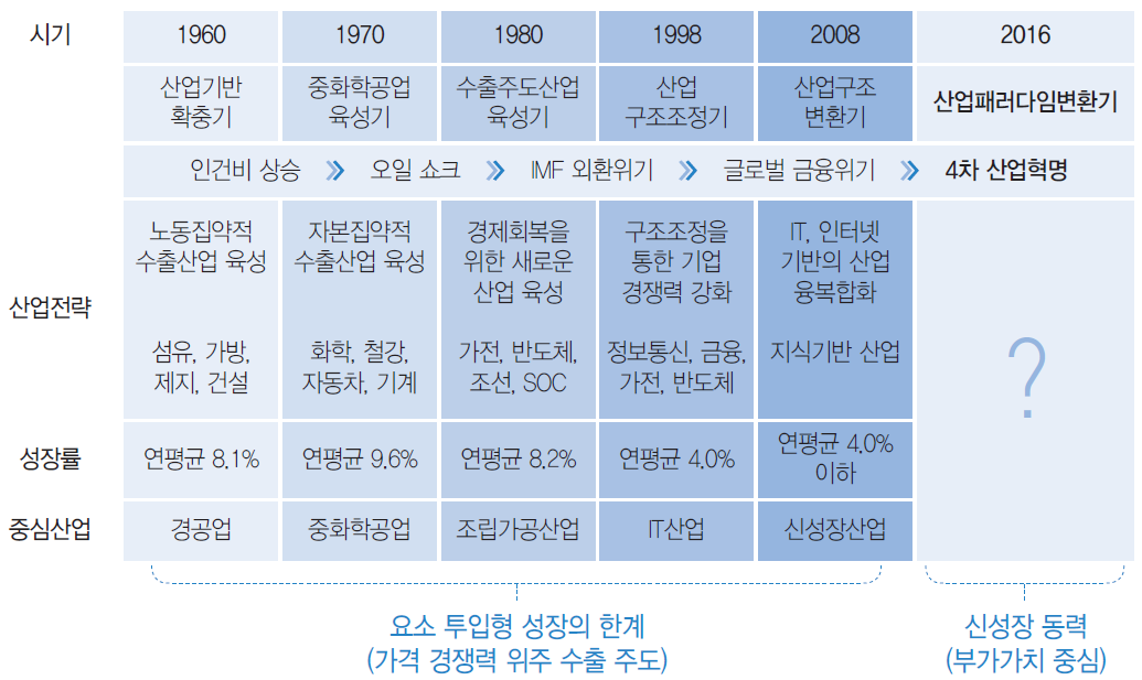 - 대한민국의 경제 환경은 1960년대 경공업을 중심으로 가격 주도의 수출전략을 구사한 이후에 현재까지도 제조업 중심의 수출 전략을 구사하고 있으며, 여기에는 선진국이나 앞서가는 글로벌 기업에서 새로운 분야를 개척해 놓으면, 이를 벤치 마크해서 더욱 개선된 제품과 서비스를 싼 가격에 내놓는 방식인 ‘fast follower’ 전략을 주로 구사하였음.