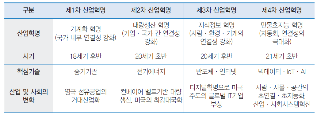 ㅇ 4차 산업혁명은 초지능화 시대, 초연결화 시대, 디지털·물리적·생물학적 영역의 경계가 없어지면서 기술이 융합되는 새로운 시대를 지칭함.