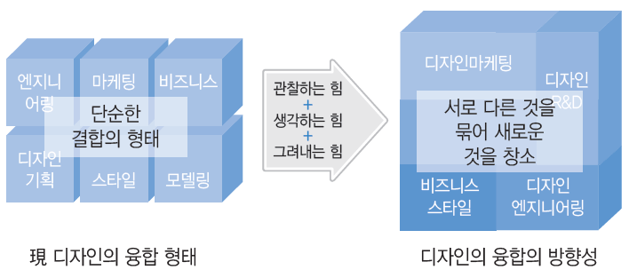 - 디자인 융합의 방향은 디자인이 가지고 있는 고유의 역량들(관찰하는 힘, 생각하는 힘, 그려내는 힘)을 세분화시키는 과정을 거치고, 디자인이 아닌 다른 분야와 결합하여서 창조와 혁신의 시너지 효과를 창출할 수 있도록 서로 다른 것과 경계 없이 하나의 틀에 재조합해 내는 통섭(統攝)을 해내는 것이 중요함.