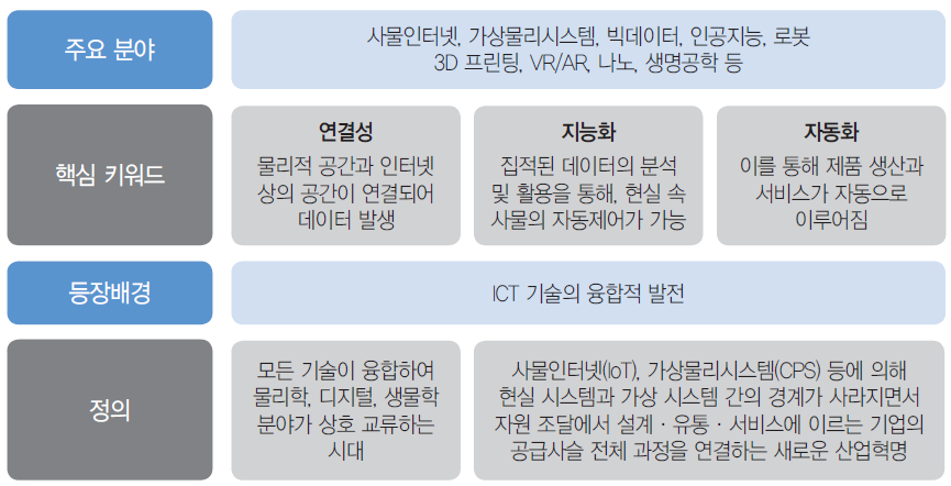 o 디지털·물리적·생물학적 영역의 경계가 없어지면서 기술이 융합되는 인류가 한 번도 경험하지 못한 새로운 시대를 지칭함.