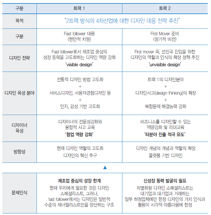 ㅇ Fast Follower 기반의 디자인(제품과 서비스 중심), First Mover를 준비하는 디자인(새로운 가치와 사업 창출)의 ‘디자인산업의 2 트랙 대응전략‘이 필요함.