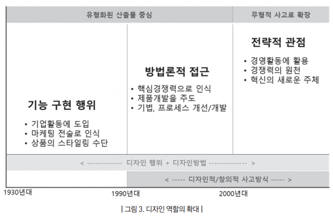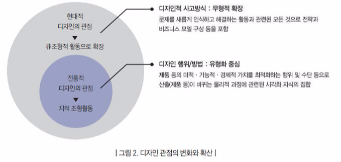 o 전통적 디자인 관점은 제품 및 서비스 혁신을 통한 브랜드의 경쟁력을 높이고 브랜드 가치를 증대하는데 있었지만, 현대의 디자인은 문제의 인식과 해결 과정의 무형적 확장에 디자인적 사고방식이 반영되어 경영활동 전반에서 활용되고 새로운 비즈니스 모델 창출까지 포함함.