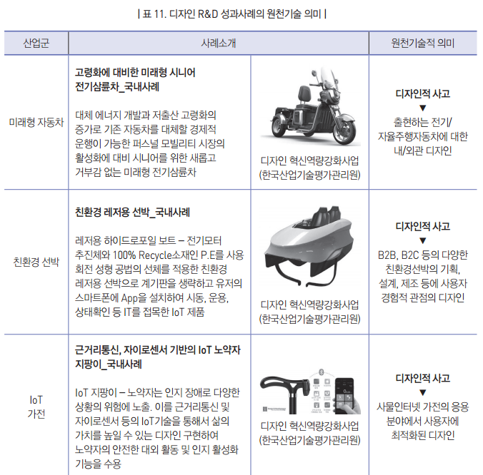 o 디자인 인식 변화와 역할 확대 등 디자인을 바라보는 관점의 변화가 요구되며 디자인 주도적으로 기술을 이끌어 가는 디자인 중심의 원천기술 발굴이 필요함.