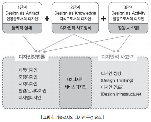 ㅇ 산업적 관점에서 기술로서의 디자인이 중요한 의미를 가지게 됐고, 관련한 디자인의 산업기술적 정의가 필요해짐. 디자인의 기술적 의미는 산업적 관점에서 '디자인방법론‘과 ’디자인적 사고력' 으로 정의할 수 있음.