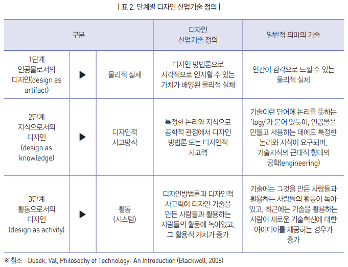 o 산업기술 발전단계로서 디자인을 정의하면 ‘인공물로서의 디자인’, ‘지식으로서의 디자인’, ‘활동으로서의 디자인’과 같이 3단계 구분하여 판단할 수 있음.