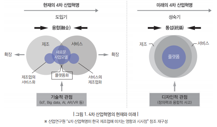 o 4차 산업혁명의 성숙기에는 창의력과 융합적 사고가 기반이 되는 디자인 관점의 접근 방식이 핵심이 되면서 융합을 넘어 통섭의 개념으로 제조와 서비스 산업이 확대될 것으로 예상됨.