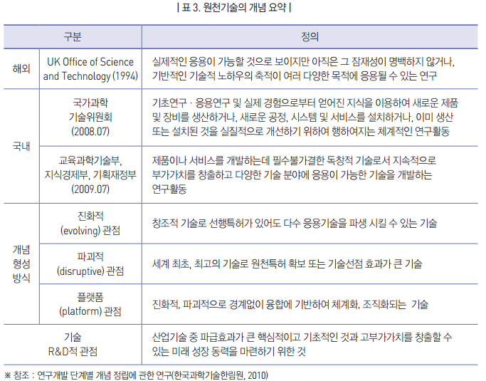 o 원천기술에 대한 정의는 해외와 국내에서 정의하는 것과 개념형식방식 및 기술 R&D의 관점에서 다음과 같은 다양하게 정의되어 있음.