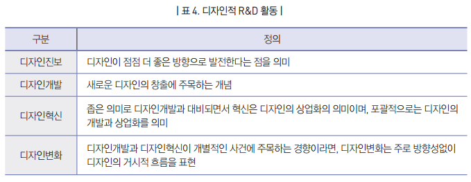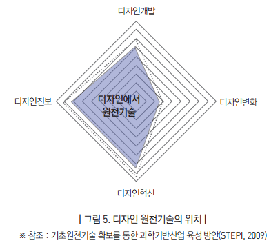 o 디자인 원천기술은 방향성 없이 거시적 흐름보다는 디자인에 대한 개발, 진보, 혁신적 활동 측면이 강함.