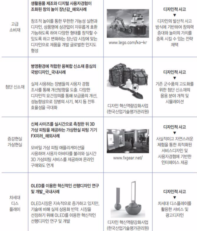 o 디자인은 창의적이고 혁신적인 사고로 기술을 구현하고 이윤추구를 위한 실현 가능한 비즈니스 전략을 모색하며 사용자의 공감을 유도하여 만족을 줄 수 있음. 이러한 디자인적 사고력은 '물리적 실체와 지식의 융합을 통해서 불확실한 미래 가치를 과감하게 시각화하는 활동시스템'이라 할 수 있음.