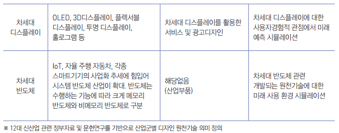 ㅇ 디자인에 대한 원천기술적 접근을 위하여 디자인적 활동과 원천기술의 범주, 기술 R&D 등 다양한 관점과 시각에서 접근이 필요하며, 이러한 디자인 원천기술의 의미를 12대 신산업에서 발굴하고, 구체적인 개념을 정의함