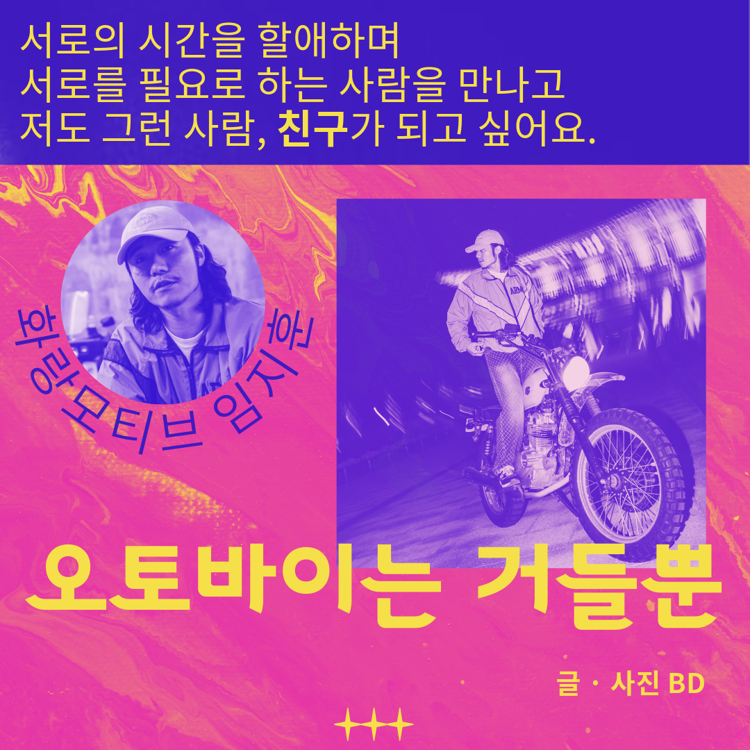 지금은 천안 사람들밖에 생각나지 않네요. 계속 쭉 같이 타고 싶어요. 사전에 질문지에 적힌 '오토바이를 함께 타고 싶은 사람'을 '앞으로도 함께 타고 싶은 사람.'으로 생각해 봤어요. 서로의 시간을 할애하며, 서로를 필요로 하는 사람을 만나고 저도 그런 사람, 친구가 되고 싶거든요.