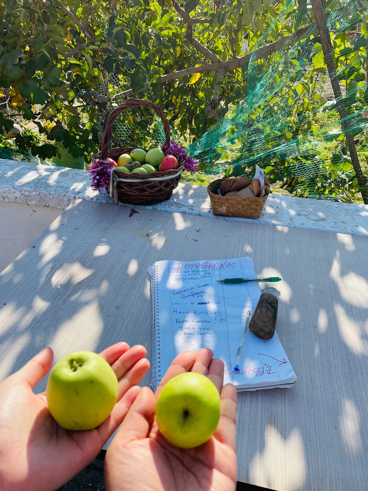 한 마을에 들어서자 순례자들을 위해 작은 사과가 담긴 바구니와 메모를 남길 수 있는 노트가 보인다. 우리는 작은 사과 하나씩을 고르고 노트에 이름과 모두가 좋은 여행이 되길 바라는 마음으로 'Buen Camino'라고 짧은 글을 남겼다.