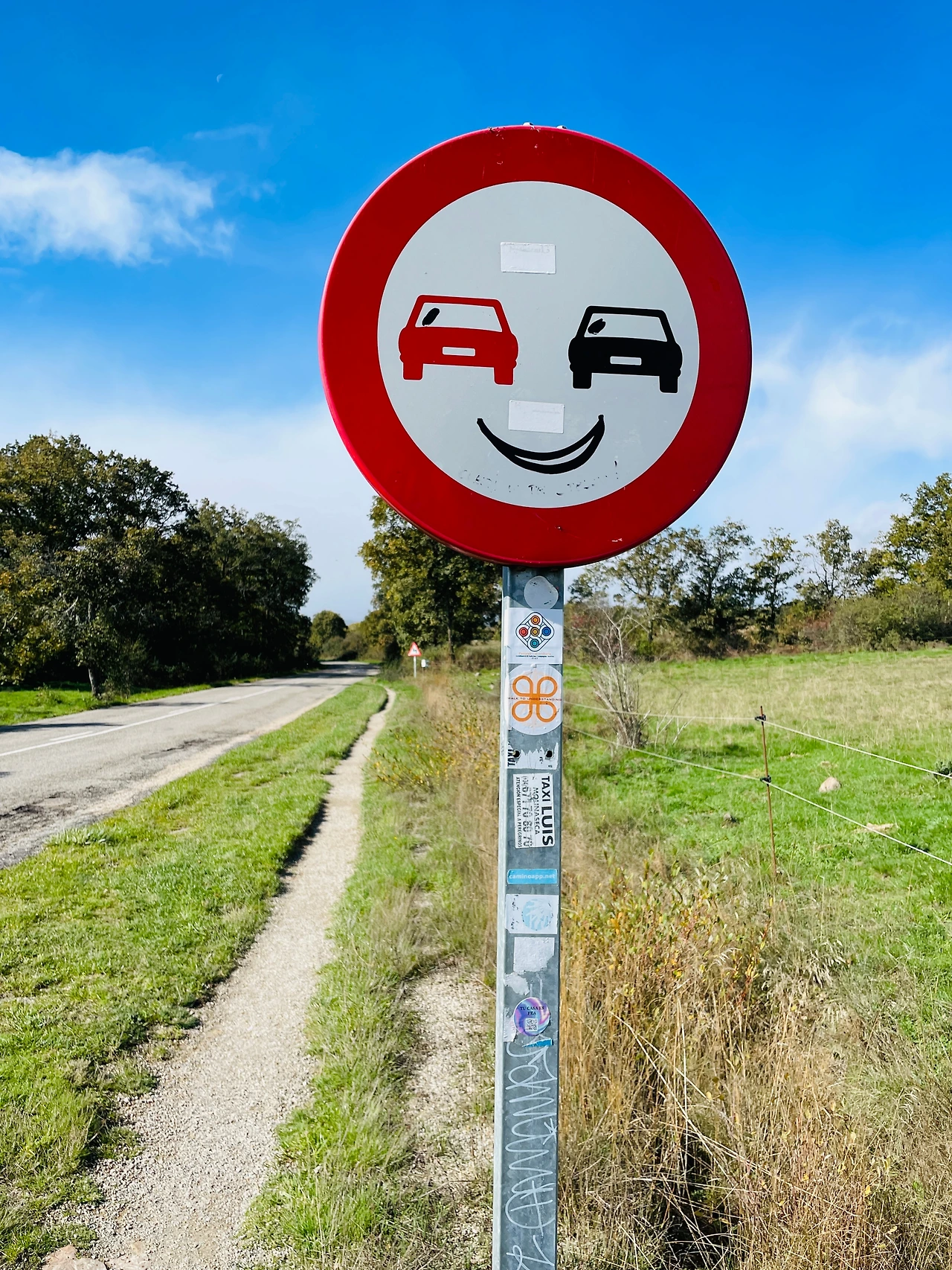 또 차 두대(빨간색, 검은색)가 그려진 표지판에는 웃고 있는 입모양을 그려 넣어 사람 얼굴처럼 만들어 놓았다. 도대체 무슨 의미 인지도 모를 표지판을 보고 피식 웃게 된다. 친구와 그 표지판의 의미를 유추해 보았는데 알 길이 없었고, 나중에 찾아보니 순례자, 자전거, 자동차가 뒤엉키는 길에 순례자가 많아 위험하니 추월하지 말고 운전하라는 의미였다고 한다.