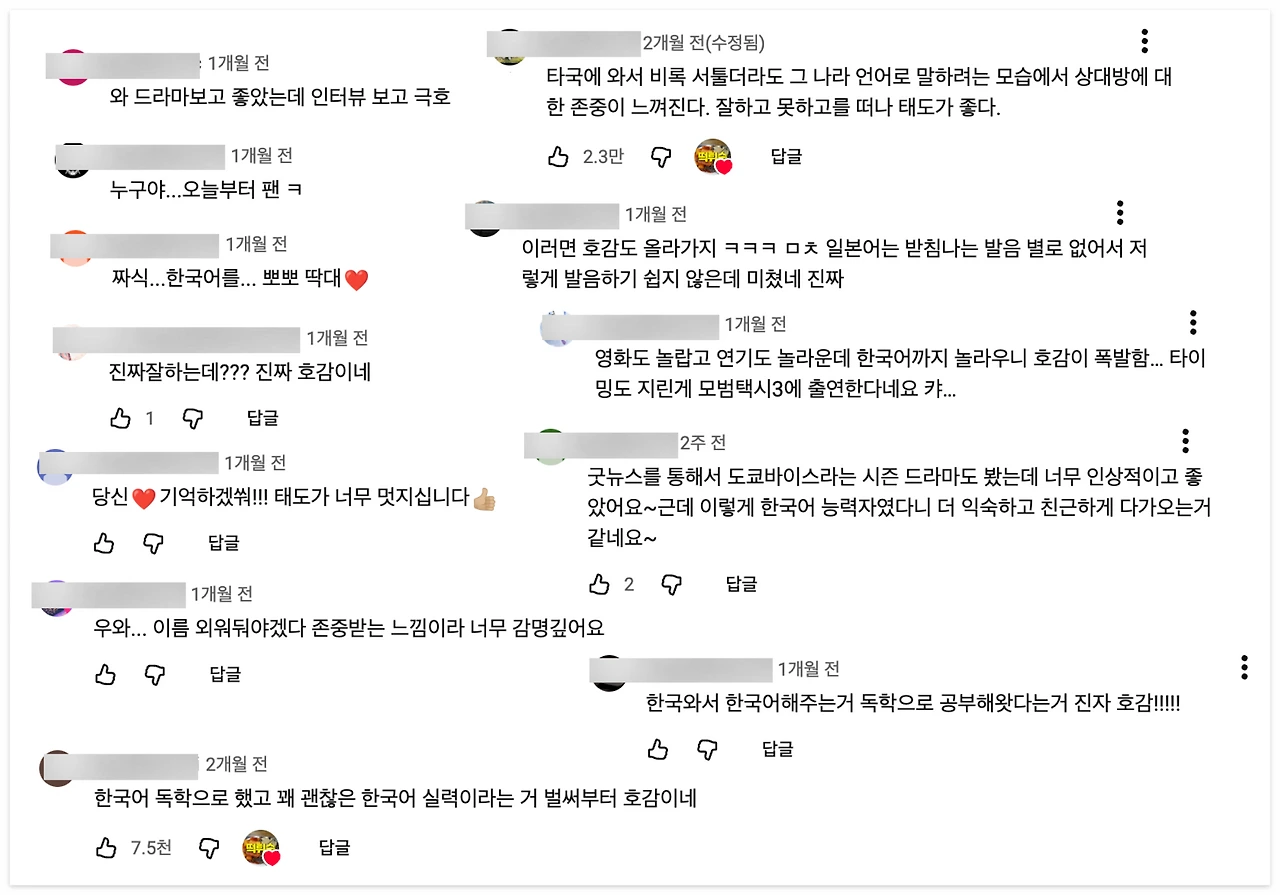 댓글을 보면, 그의 한국어 실력에 대한 찬사가 대부분이다. 반응은 대체로 한국어를 하다니 감동이다, 괜히 정이 간다, 독학으로 저렇게 잘하다니 대단하다, 앞으로 이름 외울 거다, 더 크게 되면 좋겠다, 한국에서도 많이 활동해 달라는 내용이다.