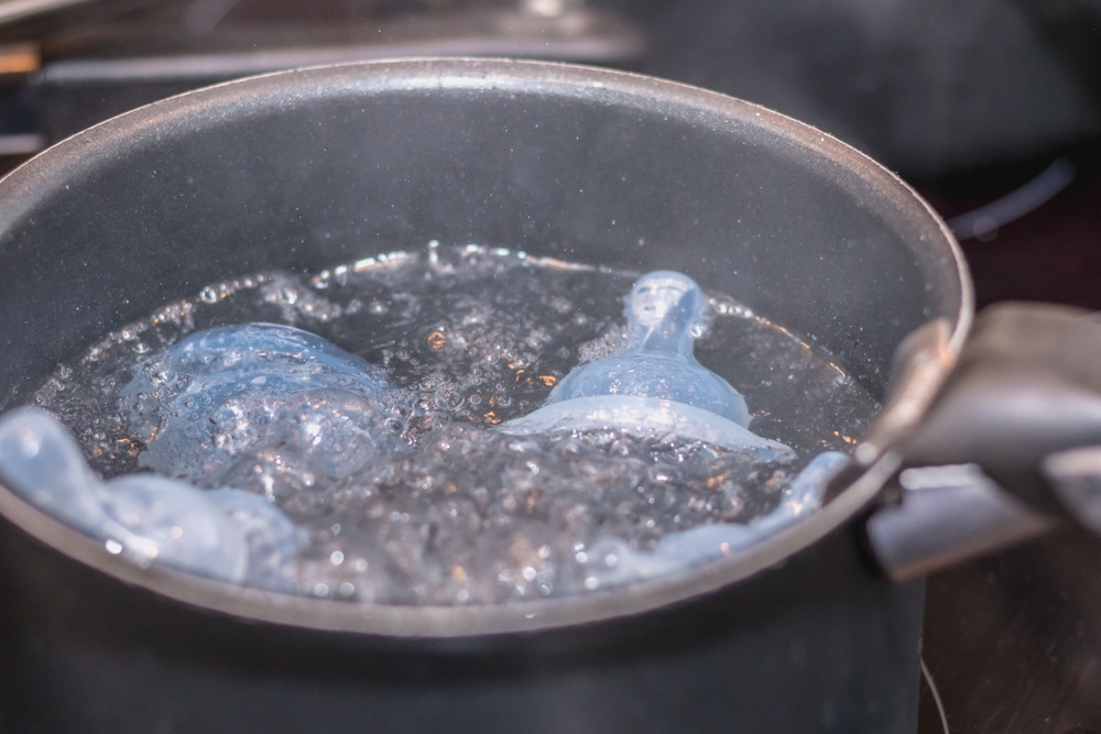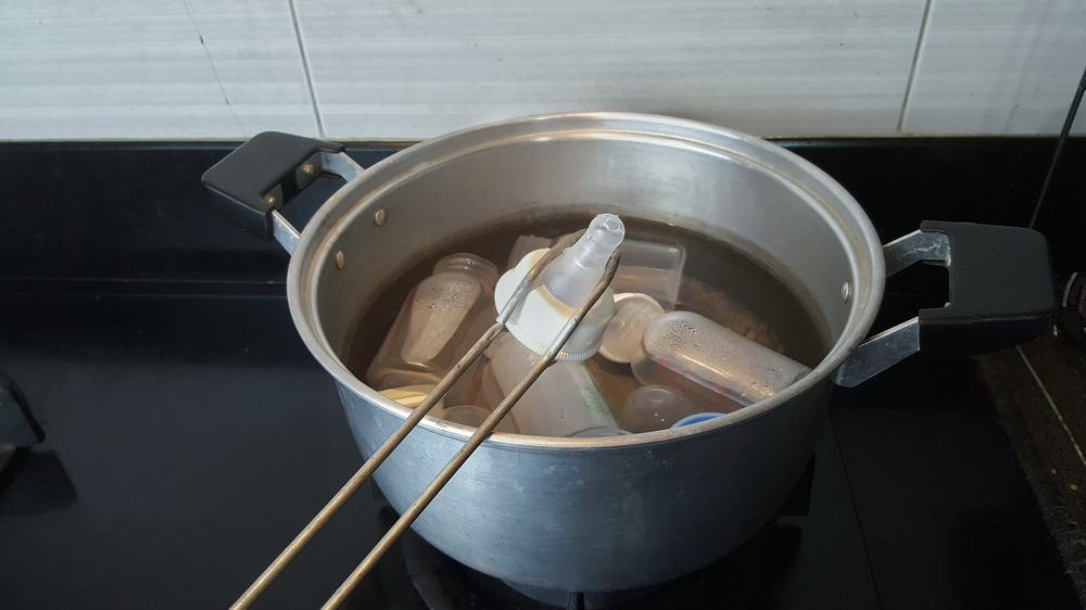 열탕 소독으로 젖병을 세척하려면 젖병이 완전히 담길만큼의 끓인 물을 먼저 준비합니다. 그리고 끓는 물 안에 젖병과 젖꼭지를 분리하여 넣어줍니다. 너무 오래 소독하는 것도 좋지 않은데요. 젖병은 2-3분, 젖꼭지는 30초 정도만 끓는 물에 소독하고 꺼내줍니다. 이제 꺼낸 젖병과 젖꼭지를 세워서 청결하게 말려주면 됩니다.