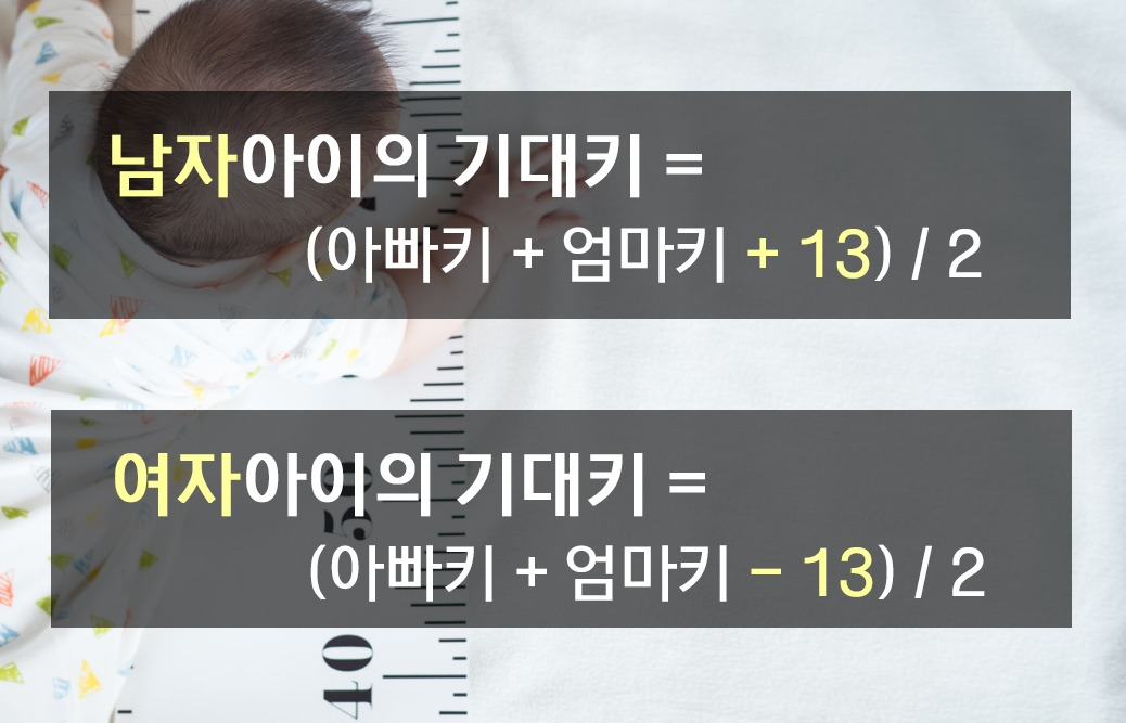성장에 가장 큰 영향을 미치는 단일 요인은 단연 유전적 요인이라고 하죠. 자녀의 키는 후천적 요인도 있으나, 유전적 요인이 어느정도 영향을 미친다는 연구 결과가 있을 정도로 부모의 키는 자녀의 키와 연관이 깊습니다. 때문에 위의 성장계산식 또한 부모의 키를 기준으로 산출식이 책정된 것인데요. 이 계산법은 가족력과 성장환경에 따라 달라질 가능성은 있지만 일반적으로는 오차범위 5cm 이하로 적중하는 것으로 알려져 있습니다.