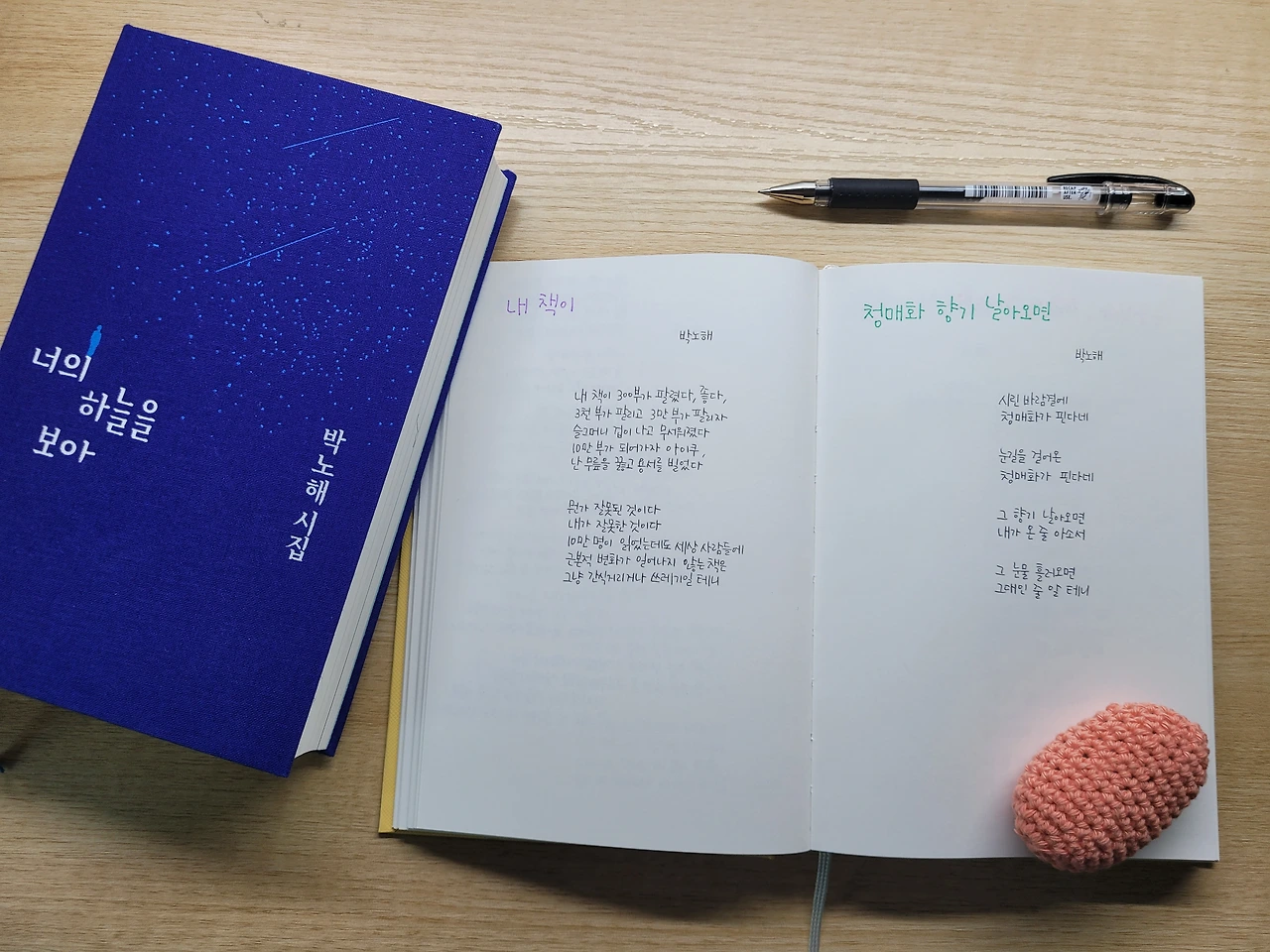 시작하게 된 취미다. 요즘은 캘리그라피 회원들과 하루 한 편의 시를 필사하고 있다. 박노해 시인의 <너의 하늘을 보아>. 524페이지의 위엄이 느껴지는 벽돌 같이 두꺼운 시집이다. 필사를 할 때마다 두꺼운 책이 들썩여신경이 쓰이다 못해 매번 곤욕이었다.