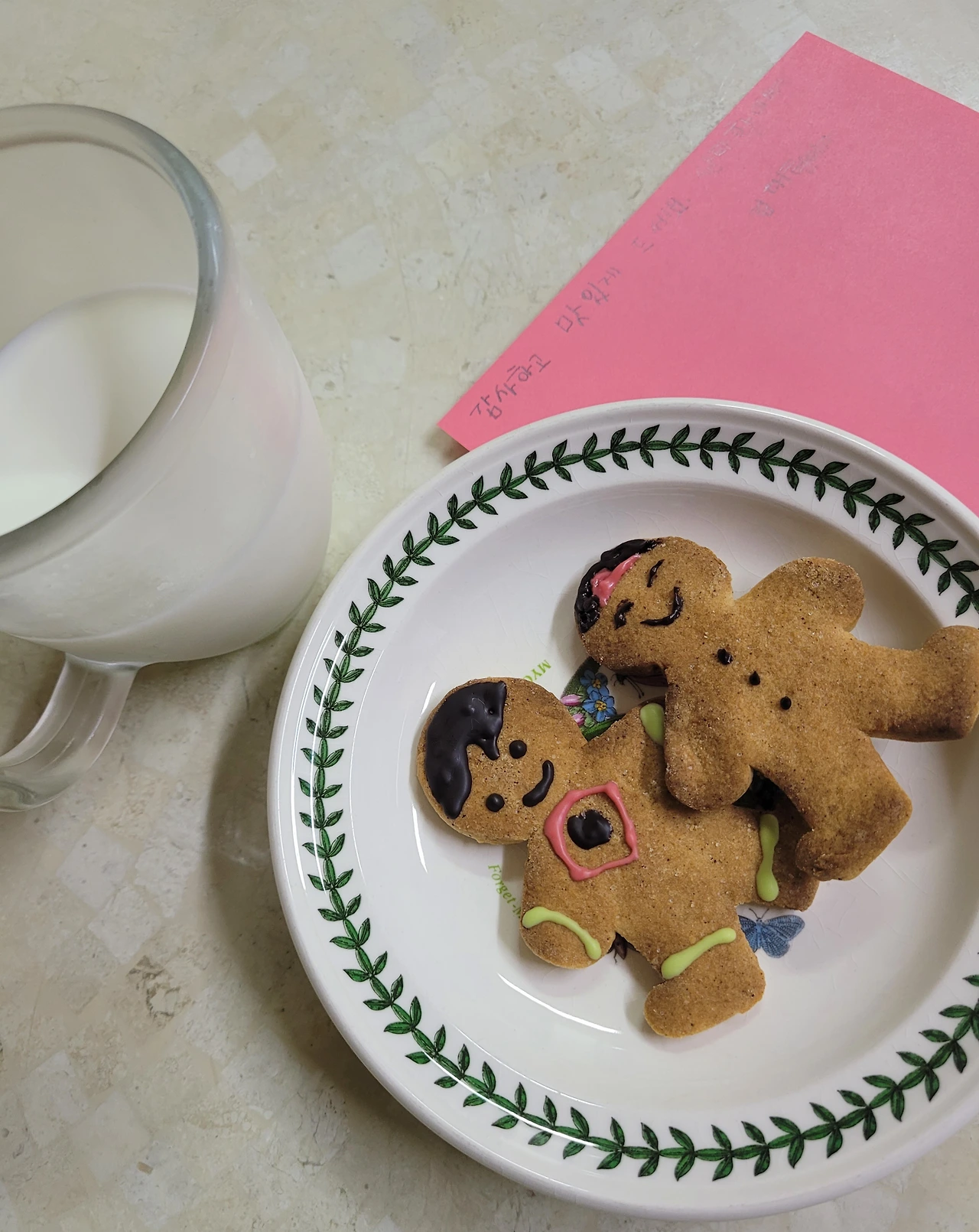 크리스마스에 진심인 초등 5학년때 모습. 산타 할아버지를 위한 진저브레드맨 쿠키 만들기. 우유와 편지를 곁들인 한상 차림.