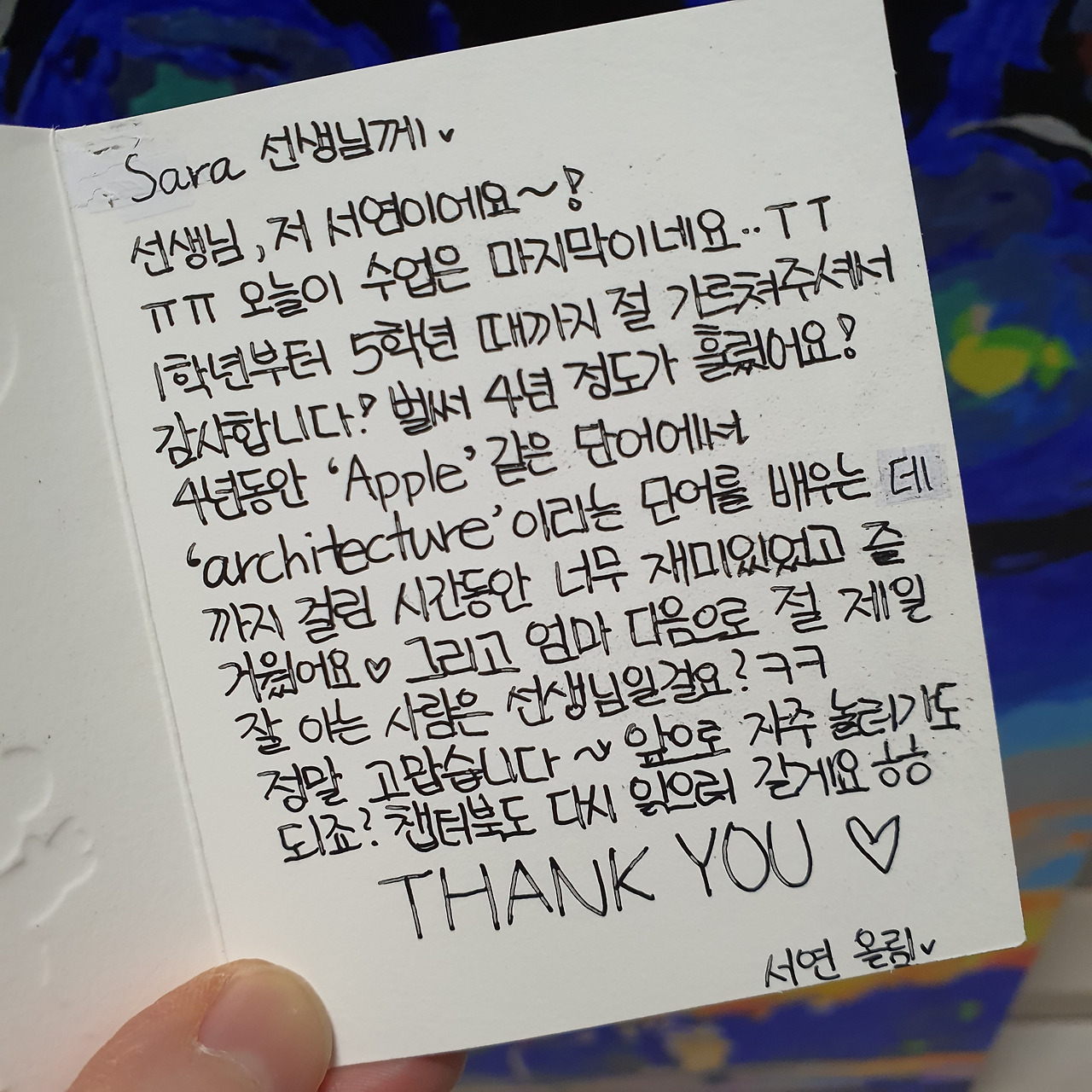 울컥하는 마음을 꾹꾹 누르고 마지막 인사말도 골라본다. 허전한 마음에 선물도 사놓고 카드도 쓴다. '그동안 선생님과 공부하느라 애썼어. 매일의 노력 고마워. 너의 성장을 지켜볼게...'