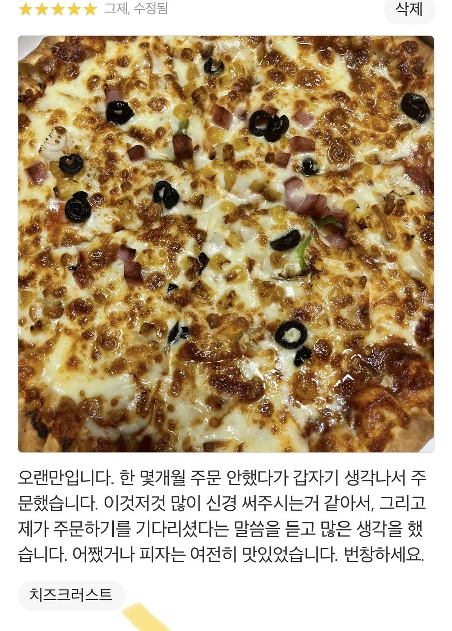 오래간만에 맛집 찾았다고 생각했는데, 이렇게 손절하게 되니 마음이 아팠다. 하지만 어쩌겠는가, 이런 일을 당했는데도 또 주문하면 호구 인증이니 그냥 새 피자집을 찾자고 다짐했다. 그리고 어차피 후기 안 보시는 거 같으니 딱히 타격감도 없으시겠지?