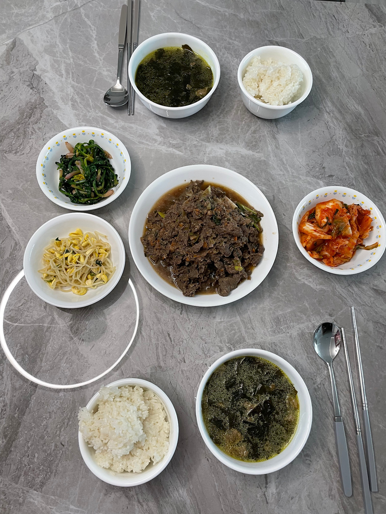 이렇게 나의 마흔 번째 생일상이 완성되었다. 남편은 식탁에 앉자 마치 본인 생일인 거 같단 이야기를 한다. 남들이 봤을 땐 조촐해 보여도 다 새로 만든, 신선한 음식만 생일상위에 올라왔다. 내가 만든 음식들이라 맛은 다 예상 가능한 범주 내에 있다. 하지만 유독 더 맛있는 거 같다. 미역국도 간이 한 번에 맞았고, 불고기는 엄마가 해주셨으니 당연히 맛있고, 나물들도 모두 신선함이 가득하고, 비비고 김치도 시큼하니 맛있고.