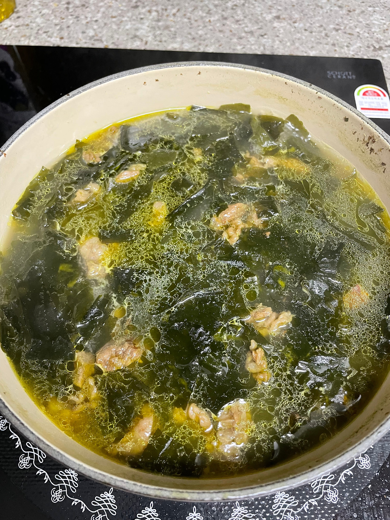 생일에 절대 빠질 수 없는 미역국. 잘 끓인 미역국은 저 초록색 기름이 국 표면에 동동 떠오른다. 오늘의 미역국은 매우 성공적이다.
