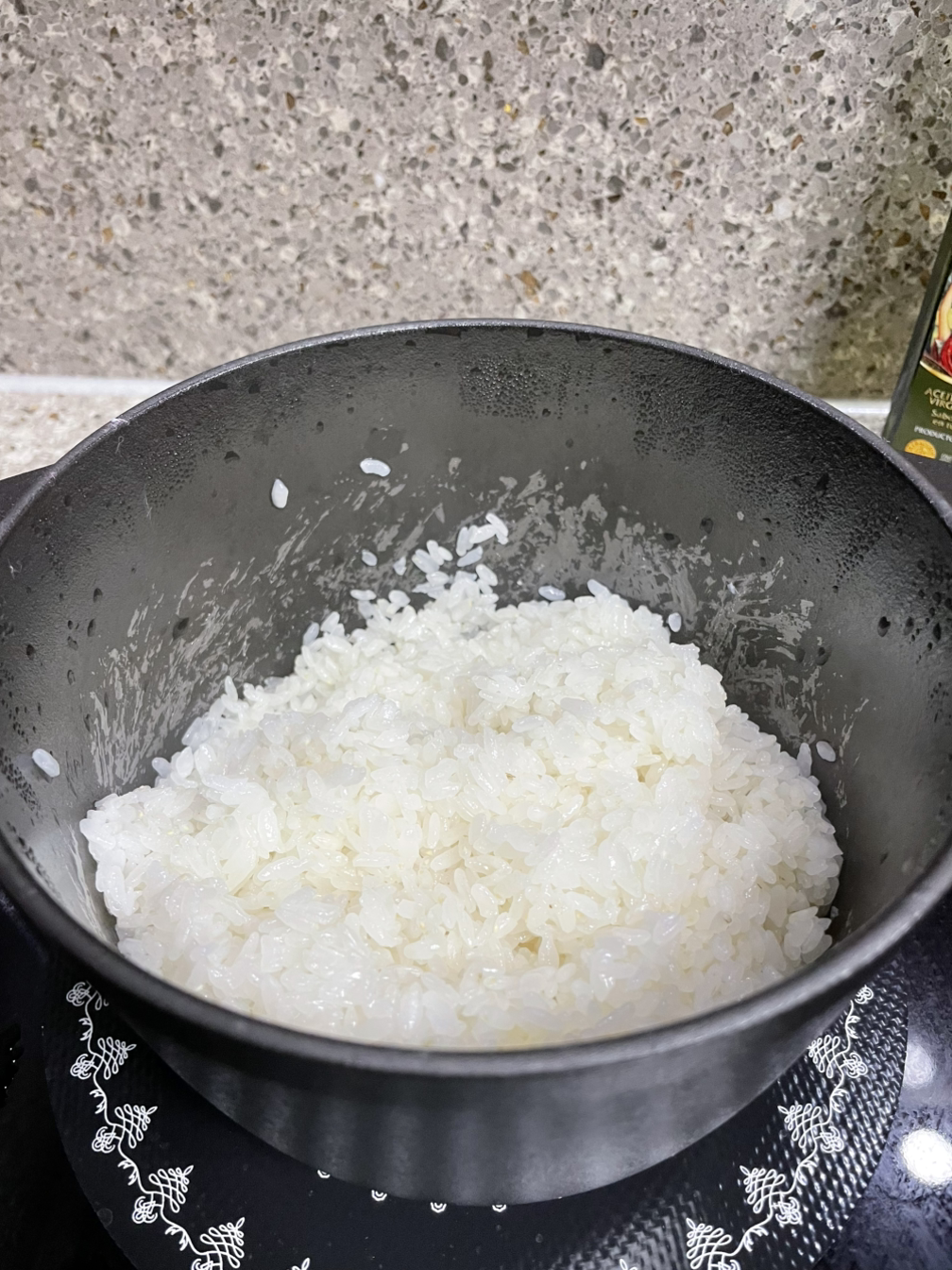 3. 불을 끄고 나서 밥을 전체적으로 골고루 섞어 준다. 이 상태에서 바로 밥을 퍼 먹어도 맛있긴 하지만 더 맛있게 먹는 방법은 다시 냄비 뚜껑을 닫아 뜸을 들이는 것이다. 불은 꺼져있지만 무쇠솥이 머금고 있는 잔열이 밥을 더 맛있게 뜸 들여 준다.